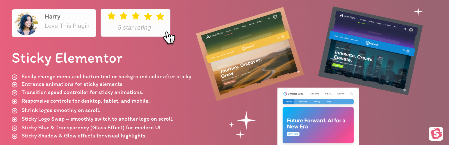 Sticky Elementor is a lightweight and powerful plugin that lets you make any Elementor container sticky — including headers, sections, navigation bars, call-to-action blocks, and even logos.